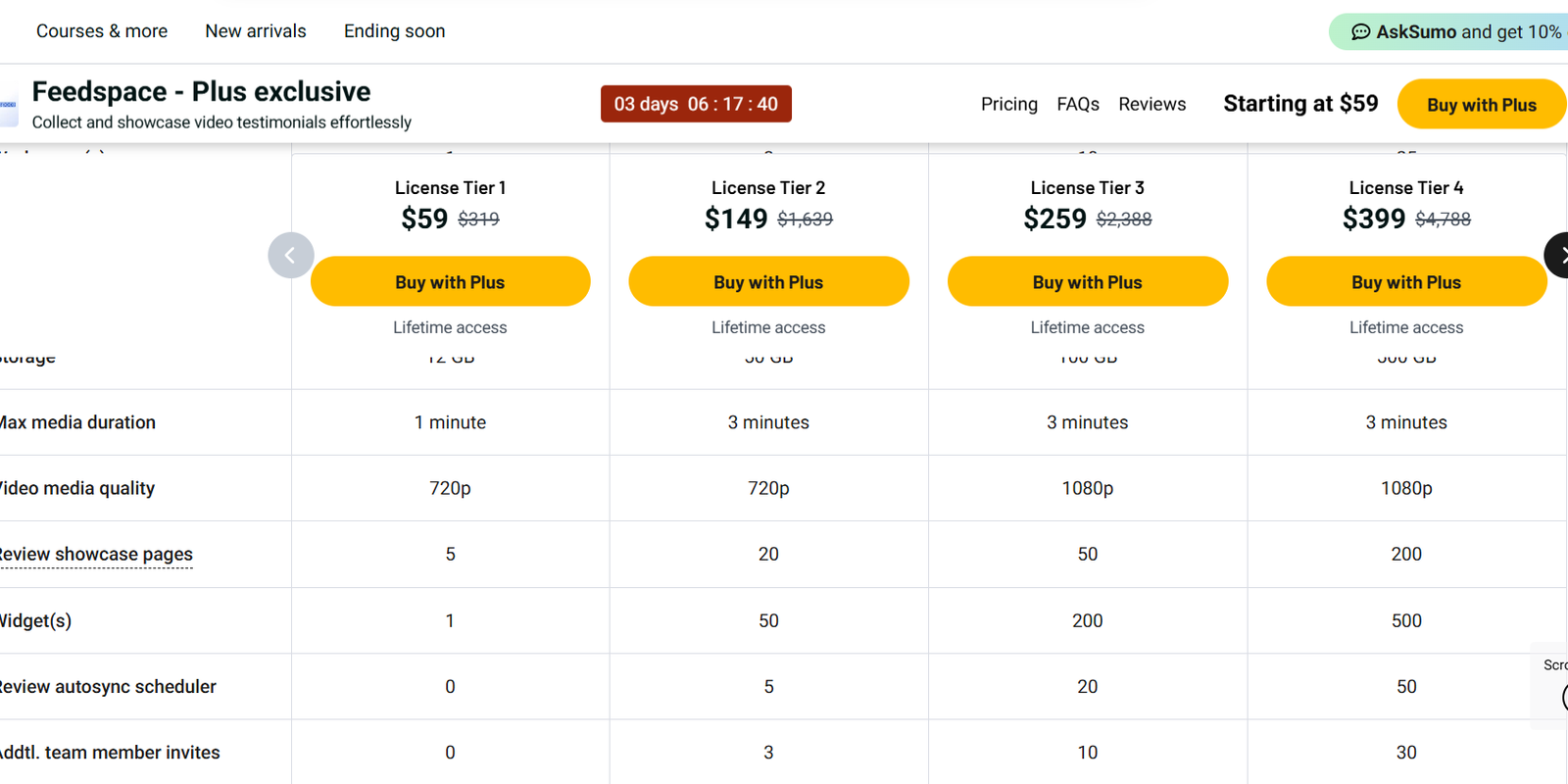 AppSumo lists multiple tiers (Tier 1–4) with increasing limits (workspaces, forms, storage, widgets, autosync schedulers, etc.). Higher tiers unlock 1080p downloads, API/webhooks, and more generous quotas. Always check the live tier table before purchase, as specifics can change during promos. AppSumo